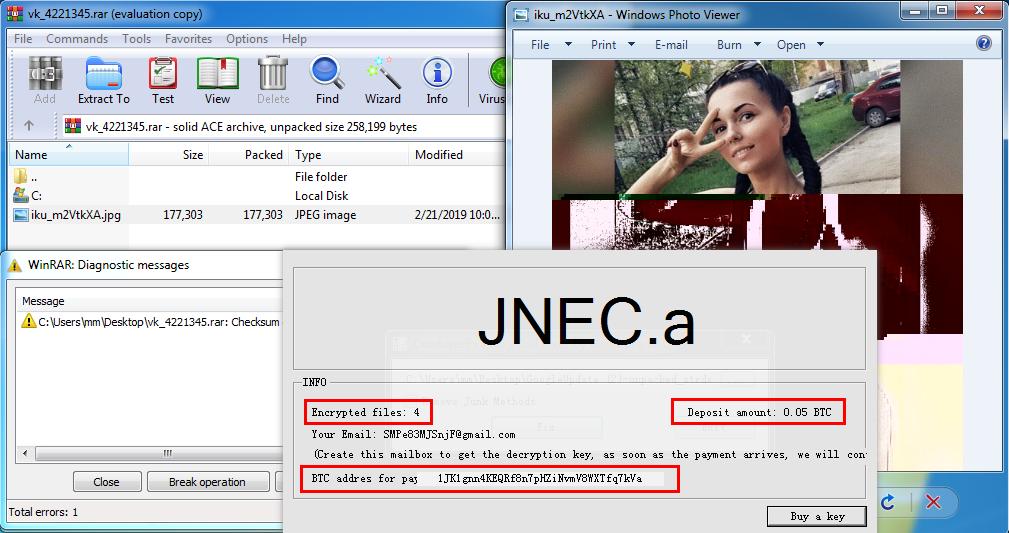 Проблему устранили с релизом WinRAR 5.70 Beta 1, еще в январе текущего года. Разработчики приняли решение отказаться от поддержки формата ACE вовсе. Тем не менее, первые атаки на уязвимость были замечены экспертами уже в феврале, а на прошлой неделе стало известно, что для бага появилось уже более 100 разных эксплоитов. Теперь специалисты 360 Threat Intelligence Center предупредили о появлении шифровальщика JNEC.a, который написан на .NET и тоже распространяется с помощью свежей уязвимости. https://pbs.twimg.com/media/D16lhsUVAAAeho8.jpg:large Исследователи пишут, что атакующие обманом вынуждают своих жертв распаковать вредоносный архив, из-за чего шифровальщик проникает в директорию Startup и начинает работу при следующем входе в систему. Малварь маскируется под файл GoogleUpdate.exe, который легко спутать с настоящим средством обновления Google. https://xakep.ru/wp-content/uploads/...ogleUpdate.png Интересной особенностью JNEC.a является механизм, с помощью которого жертвы должны оплачивать выкуп и связываться со злоумышленниками. Пострадавшим предлагается создать на Gmail ящик с определенным уникальным адресом (указан в требовании преступников) и перевести 0,05 BTC (около 200 долларов США) на кошелек преступников, после чего жертве на свежесозданный ящик пришлют ключ дешифрования. https://xakep.ru/wp-content/uploads/...ansom-note.png Эксперты отмечают, что в настоящее время, согласно VirusTotal, лишь 34 защитных продукта определяют JNEC.a как угрозу. Кроме того, скверную новость для всех пострадавших сообщил известный ИБ-специалист Майкл Гиллеспи (Michael Gillespie). По данным эксперта, разработчики JNEC.a допустили в коде ошибку, и пострадавшая в результате работы шифровальщика информация не подлежит восстановлению, расшифровать файлы не смогут даже сами преступники. https://www.2-spyware.com/news/wp-co...bitcoin_en.jpg |