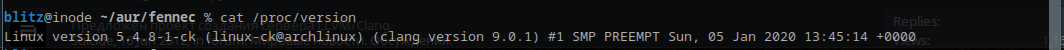 Linux version 5.4.6-2-ck (linux-ck@archlinux) (clang version 9.0.0 (tags/RELEASE_900/final)) #1 SMP PREEMPT Tue, 24 Dec 2019 18:17:39 +0000