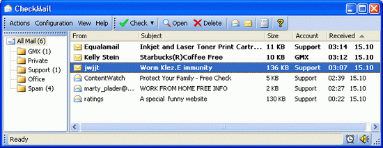 Обновилась удобная программа для проверки POP3-ящиков. CheckMail позволяет проверять новые сообщения в нескольких ящиках сразу, не загружая письма с сервера. Таким образом, вы можете удалять некоторые сообщения прямо с сервера, не скачивая их. Программа поддерживает фильтры и никогда не запускает аттачменты, скрипты, программы и другие потенциально опасные элементы.