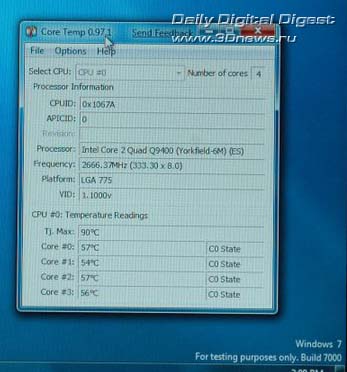 Ранее мы уже видели, что при работе процессоров на частоте 451 МГц температура ядер составляет в среднем 34-38 градусов Цельсия. При работе Core 2 Quad Q9400s на штатной частоте (2,66 ГГц) утилита Core Temp показывает температуру ядер в диапазоне 54-57 C°.