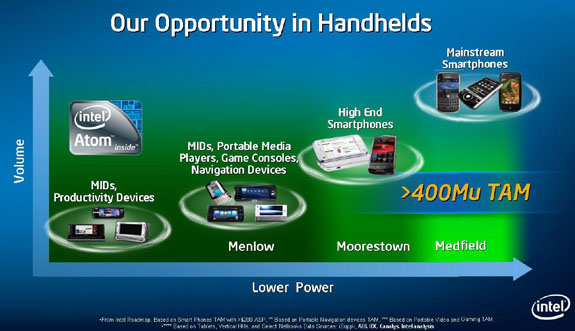Согласно официальным заявлениям, платформа Moorestown будет отличаться экономичностью – в режиме простоя потребляемая мощность снизится сразу на 50%. Однако, по мнению большинства, этого явно недостаточно, чтобы Moorestown смогла освоить рынок смартфонов, где от процессора и чипсета требуется еще меньшая «прожорливость». Дело осложняется еще и тем, что рынком мобильных аппаратов правят сегодня ARM-решения, с которыми Moorestown вряд ли справится. Впрочем, сама Intel рассчитывает, что в секторе MID-решений, где на первый план выходит уже производительность смартфонов, их платформа сможет составить конкуренцию противникам.