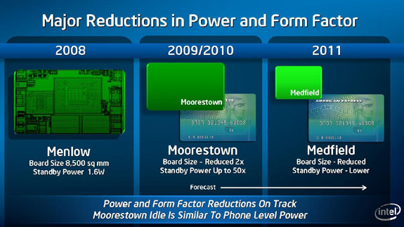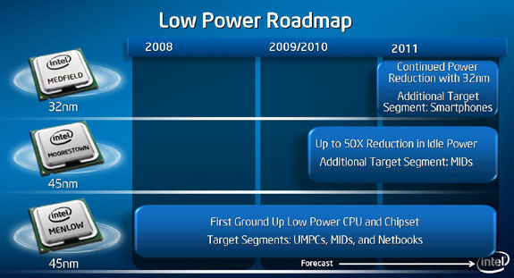 Ей станет решение с кодовым обозначением Moorestown, базирующееся на 45-нм центральных процессорах с интегрированным графическим ядром, контроллером оперативной памяти. Результатом «апгрейда» станет переход на двухчиповый дизайн платформы, когда функции одной из микросхем логики будут переданы ЦП.