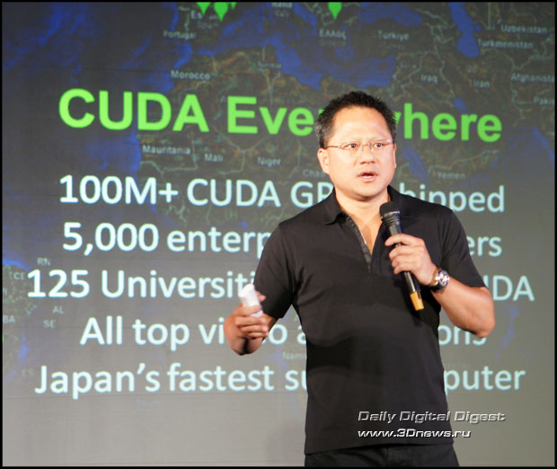 В начале своего выступления глава NVIDIA похвалился некоторыми успехами компании. Так, производитель поставил на рынок уже более ста миллионов графических ускорителей с поддержкой технологии CUDA, которая с успехом применяется в самых разнообразных областях — от современных игрушек и распределенных вычислениях до научных проектов и 3D-моделирования.