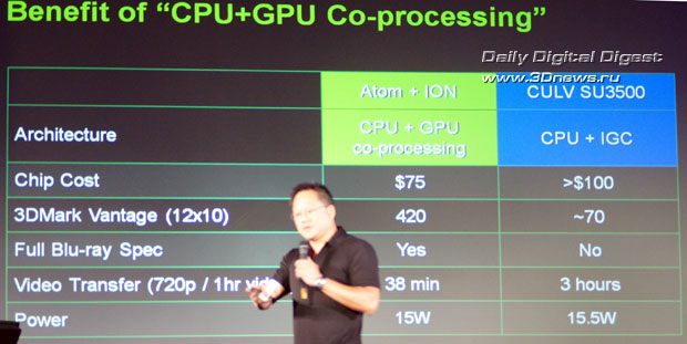 Другим ключевым моментом выступления стала платформа NVIDIA ION. Напомним, что недавно Lenovo представила свой первый ноутбук на базе ION — IdeaPad S12. Еще один интересный продукт — компактный неттоп Acer AspireRevo, который, к слову, уже поступил в тестовую лабораторию 3DNews, так что в ближайшее время ждите подробного тестирования новинки.