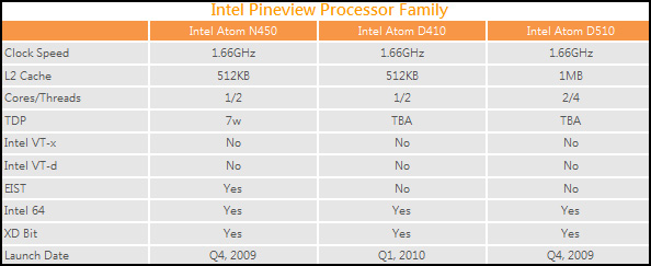 По данным источника, первенцем станет одноядерный чип Intel Atom N450 с тактовой частотой 1,66 ГГц, 512 Кб кэш-памяти L2 и уровнем TDP в 7 Вт. Премьера состоится в начале октября нынешнего года, а само оно заменит популярную ныне модель Intel Atom N270, которая в первой половине 2010 года совсем уйдёт со сцены.