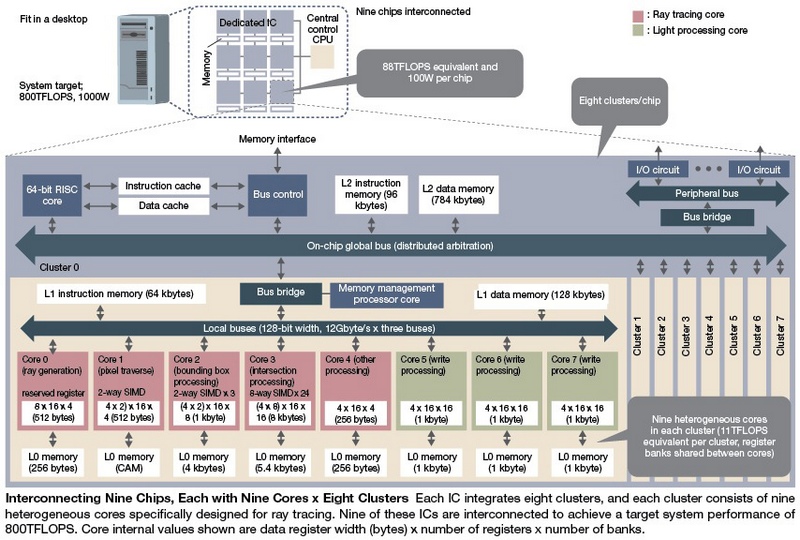 На одном чипе будут находиться 73 гетерогенных ядра, выполняющих операции трассировки лучей, девять таких чипов будут интегрированы в единое решение. Вместе с поддержкой Full HD разрешения 1920 x 1080 скорость обработки изображений у этой многоядерной ИС должна составить 800 TFLOPS.