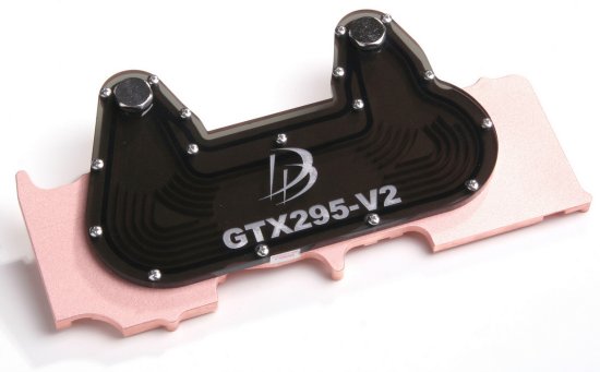 Новинка относится к водоблокам типа "full cover", что говорит о способности отводить лишнее тепло сразу от всех основных "горячих точек" охлаждаемой видеокарты. В случае с актуальной версией GeForce GTX 295 - это пара графических чипов с маркировкой G200-400-B3, микросхемы памяти GDDR3, чип-коммутатор PCI-E-шины NF200, две микросхемы NVIO2 для вывода изображения на дисплеи, а также две группы силовых ключей цепей питания. Водоблок DD-GTX295V2 состоит из медного снования и кожуха, изготовленного из полупрозрачного акрилового пластика, через который можно наблюдать за циркуляцией жидкости.