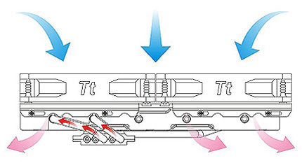 На радиаторе размещена пара рассчитанных на 50000 часов безотказной работы 120-мм вентиляторов Thermaltake ISGC Fan, скорость вращения которых может изменяться в диапазоне от 800 до 1300 оборотов в минуту. Каждый из "пропеллеров" в запущенном состоянии перекачивает до 58,3 кубических футов воздуха в минуту и создаёт шум не выше 16 дБ.