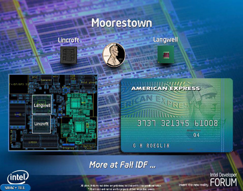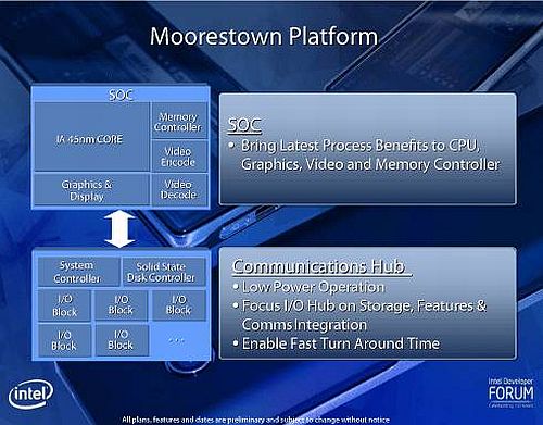 Напомним, что платформа Moorestown была представлена Анандом Чандрасекером (Anand Chandrasekher) в ходе прошлогоднего октябрьского форума Intel Developer Forum на Тайване. Тогда публика смогла увидеть первый рабочий прототип MID-аппарата. Moorestown позиционируется разработчиками в качестве решения для портативных MID-аппаратов, «заточенных» под работу с онлайн-приложениями и обладающими широким набором мультимедийных функций. При этом главными особенностями устройств на базе новой платформы станет не столько выросшая производительность, сколько экономичность и длительное время автономной работы от одного заряда аккумуляторов.