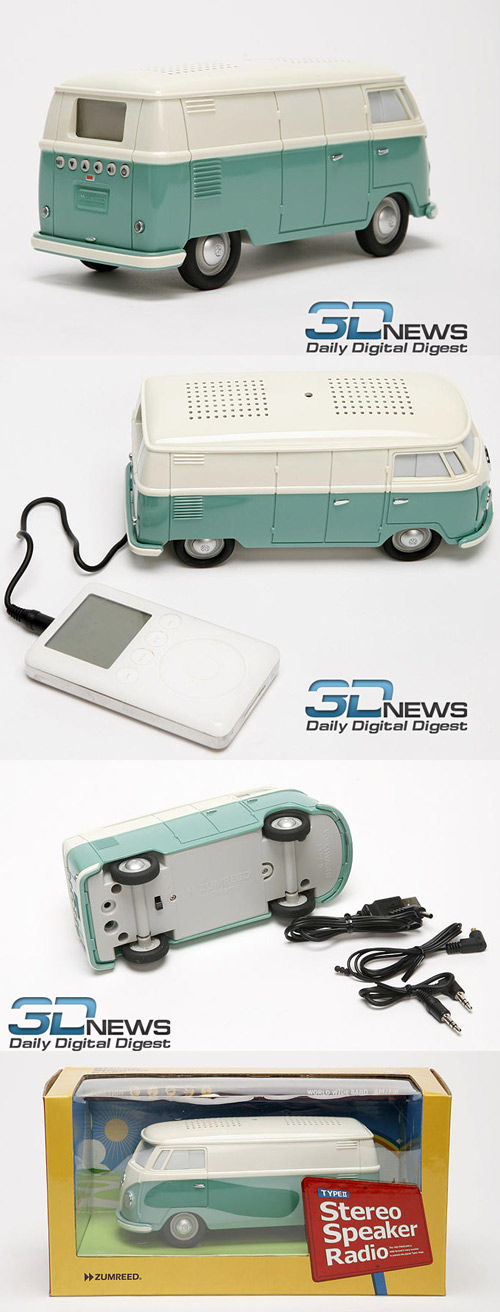 Любители ретро-автомобилей могут украсить свой рабочий стол необычными колонками, выполненными в виде старенького автобуса Volkswagen. Забавное устройство нужно подключить к iPod через имеющийся в комплекте кабель, или же через USB-порт к компьютеру. В колонки также встроено АМ/FM радио.