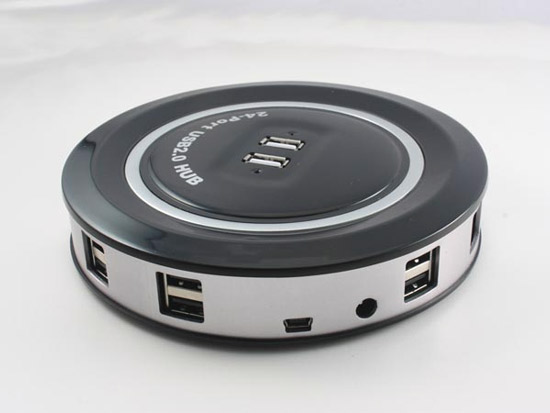 Решением проблемы в этом случае может стать новый USB-хаб, появившийся в магазине UsbFever. Эта модель в полной мере оправдывает свое название - Super USB 24-Port Hub. Данное устройство имеет форму плоского цилиндра и позволяет подключить к компьютеру дополнительно 24 устройства. Поскольку для такого огромного количества устройств питания USB шины будет недостаточно, концентратор использует свой собственный источник питания - адаптер переменного тока 100~240 В, рассчитанный на потребление до 4 A. Цена устройства - 70 долл.