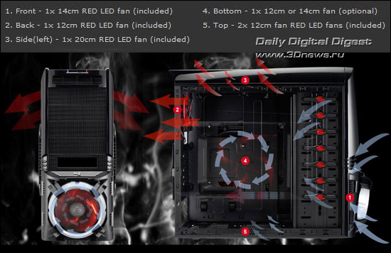 Внутри изначально установлены пять вентиляторов с красной светодиодной подсветкой, а именно один 140-мм фронтальный, один 120-мм тыловой, один 200-мм на боковой панели и два 120-мм на верхней крышке. При желании к ним можно добавить ещё один 120- или 140-мм «пропеллер», закрепив его снизу. Также создателями предусмотрена возможность применения системы жидкостного охлаждения, для прокладки шлангов которой просверлены специальные отверстия на задней стенке.