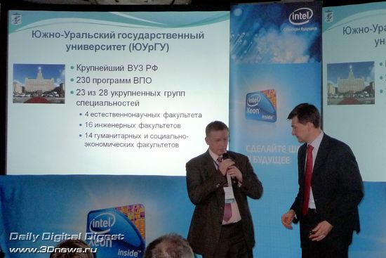 Александр Леонидович Шестаков, ректор Южно-Уральского государственного университета (ЮУрГУ), рассказал о возможностях суперкомпьютерного центра ЮУрГУ на базе двух комплексов "СКИФ-Урал" общей производительностью 40 ТЕРАФЛОПС на процессорах Intel Xeon e5472, и "СКИФ-Аврора" на процессорах Intel Xeon 5570. Применение суперкомпьютерного моделирования позволяет существенно сократить расходы на разработку новых видов продукции и технологий. За 5 лет работы в Суперкомпьютерном центре ЮУрГУ было решено более 100 значимых научно-технических задач для промышленности и науки края. Процессоры Intel Xeon 5600 уже вызывали пристальный интерес в ЮУрГУ большим потенциалом для применения в индустриальных задачах.