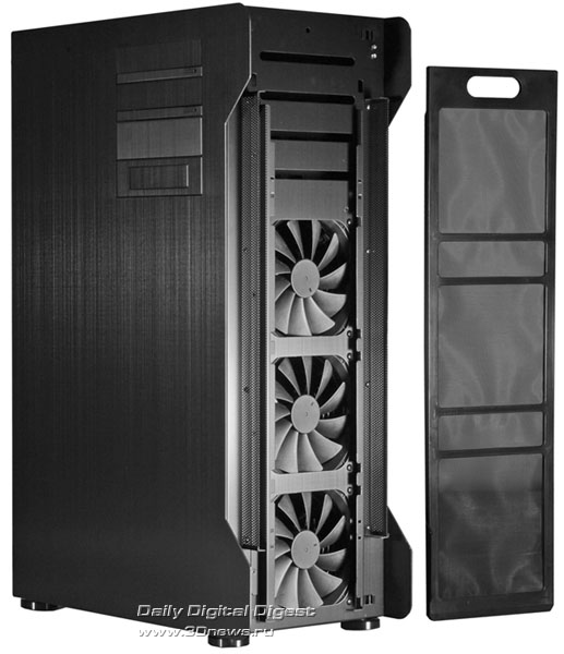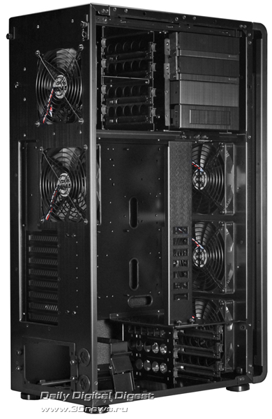 Дебютант обладает габаритами 240 x 695 x 442 мм, весит 11,7 кг, совместим с платами стандартов E-ATX, ATX и Mirco-ATX, располагает восемью слотами расширения, а также оборудован четырьмя внешними 5,25-дюймовыми отсеками (один легко трансформируется в 3,5-дюймовый) и семью посадочными местами внутри для размещения 3,5-дюймовых накопителей.
