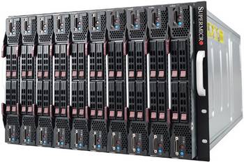 В систему Supermicro TwinBlade с шасси высотой 7U можно установить до 20 модульных серверов SBI-7226T-T2, причем в рамках этой же конструкции предусмотрена возможность оснащения коммутаторами 40 Гбит/с InfiniBand, FCoE или 10 Гбит/с Ethernet. Гибкость в выборе стандартов ввода-вывода поддерживается благодаря интерфейсу Universal I/O (UIO), позволяющему выбирать между платами контроллеров для подсистем SAS 2.0, 10 Гбит Ethernet, Fiber Channel или QDR/DDR InfiniBand. По мнению компании, столь развитая поддержка систем ввода-вывода позволяет заявлять об оптимизации TwinBlade нового поколения для применения в составе распределенных и высокопроизводительных вычислительных систем, особенно в случае применения последних шести- и восьмиядерных Intel Xeon.