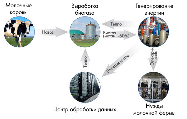 Биогаз, состоящий на 60% из метана, получается в специальных установках с помощью анаэробного сбраживания. Тепло для сбраживания подается из системы охлаждения дата-центра (ЦОД). Как видим, теперь утверждение о симбиозе ИТ-индустрии и коровьих «лепешек» не кажется какой-то небылицей.