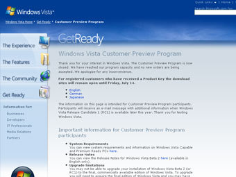 Компания Microsoft объявила об окончании программы "Customer Preview", позволявшей всем желающим скачать бета-версию Windows Vista.