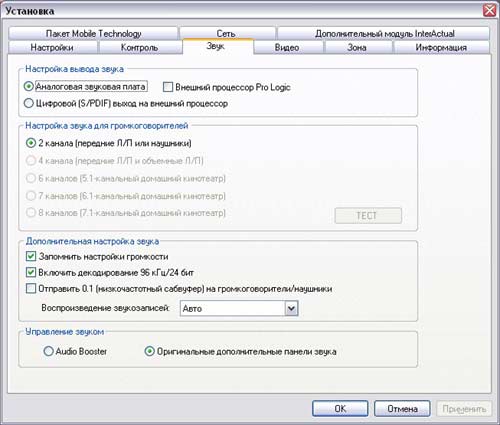 В свое время именно WinDVD впервые в индустрии компьютерных развлечений предложил полноценное воспроизведение DTS саундтреков. Пятая версия подняла планку еще выше, теперь плеер поддерживает формат 24-бит/96кГц. Правда, для подавляющего большинства российских пользователей в данном факте нет ничего примечательного, т.к. записи DVD Audio практически не встречаются на прилавках магазинов. Базовые функции обработки звука (практически аналогичные PowerDVD) можно существенно расширить с помощью дополнительного модуля Audio Booster. После его установки в правом верхнем углу интерфейса появится новая кнопка, открывающая доступ к эквалайзеру и другим разнообразным настройкам. На сайте InterVideo предлагаются и другие дополнительные модули. В частности Mobile Technology Pack для оптимизации работы на мобильных устройствах, InterActual Pack для специальных интерактивных DVD, и DVD-Audio Pack для воспроизведения соответствующих музыкальных дисков.