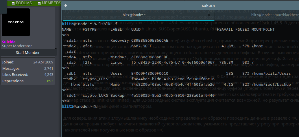 В утилите e2fsck, поставляемой в составе пакета e2fsprogs, выявлена уязвимость (CVE-2019-5188), позволяющая добиться выполнения кода злоумышленника при выполнении проверки файловой системы, содержащей специальным образом оформленные каталоги. Наличие уязвимости подтверждено в выпусках с 1.43.3 по 1.45.4. Уязвимость устранена в обновлении e2fsck 1.45.5. В дистрибутивах проблема пока остаётся неисправленной (Debian, Arch Linux, SUSE/openSUSE, Ubuntu, RHEL).
