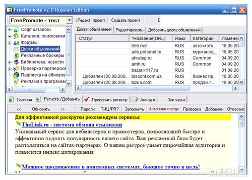FreePromote - Бесплатная программа для раскрутки сайтов и софта, путем полуавтоматической регистрации в поисковиках, каталогах, софт-каталогах(FreePromote полностью поддерживает PAD файлы).