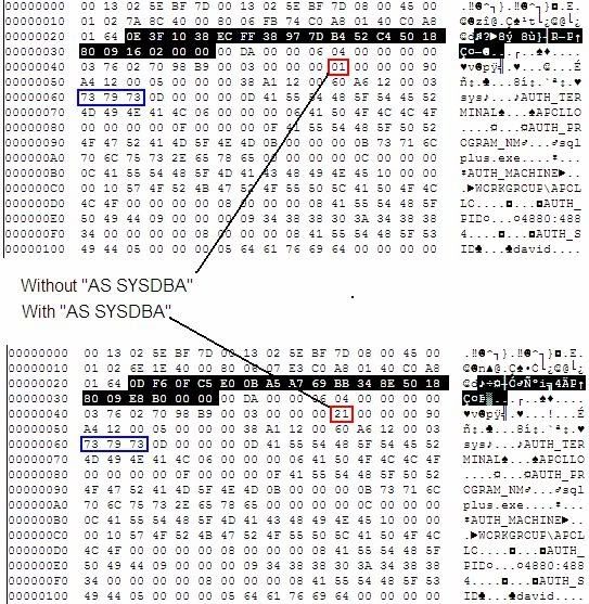 Этот флаг байт указывает на запрашиваемый уровень привилегий при подключении. 6-ой бит устанавливается если подключаться как SYSDBA, а 7-ой если как SYSOPER. Даже если 6-ой или 7-ой бит не установлены, атакующий может попробовать войти в систему как SYS. Если пароль неправильный - получим ошибку ORA-01017: invalid username/password; logon denied .