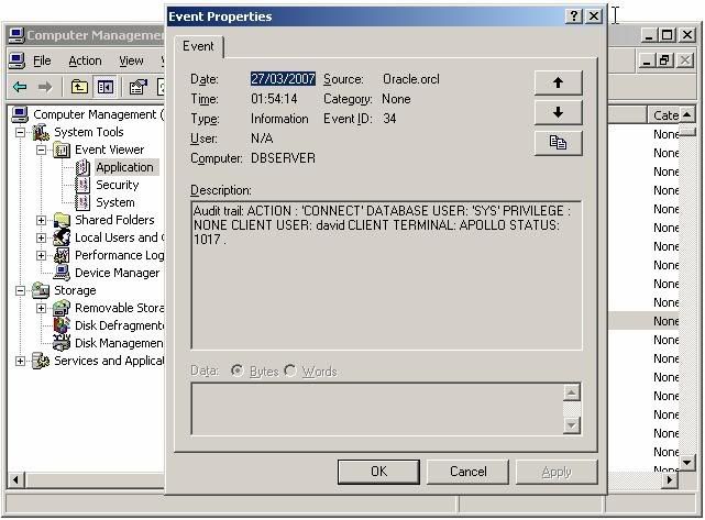 Если же атакующий установит уровень прав как SYSDBA или SYSOPER - журнал аудита это вообще не зафиксирует. Нам нужно искать свидетельства где-нибудь ещё. Дело в том, что если в Oracle доходит к привилегированным подключениям, то запись об этом создаётся в журнале событий ОС. В Виндовз это регистрационный журнал событий.