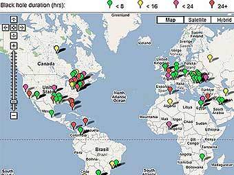 Судя по карте, больше всего черных дыр находится на восточном побережье США и в Западной Европе. Сетевые черные дыры быстро исчезают. Время их жизни редко превышает 16 часов.