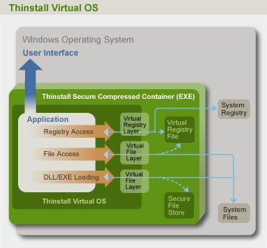 предлагает виртуализацию исполнения приложений, позволяющую заключить приложения в виртуальный контейнер и распространять их как готовые пакеты, не требующие установки, внутри контейнера создается виртуальное представление реестра и системных файлов.