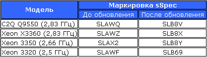 Новое извещение на сайте Intel гласит, что на степпинг E0 будут переведены процессоры Core 2 Quad Q9550 (2.83 ГГц), Xeon X3360 (2.83 ГГц) и Xeon X3350 (2.66 ГГц) - все они имеют по четыре ядра с 2 х 6 Мб кэша второго уровня. Для Core 2 Quad Q9550 маркировка сменится с SLAWQ на SLB8V. Общий список изменений нам уже знаком: