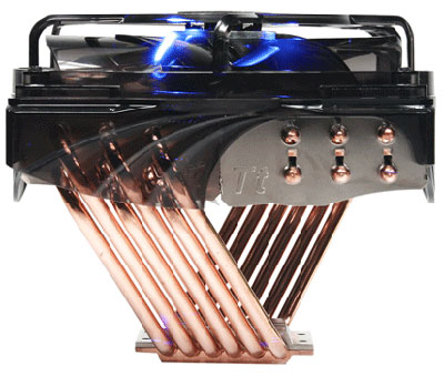 Конструктивно изделие весом 800 г состоит из отполированного до зеркального блеска медного основания, от которого в двух направлениях отходят по шесть медных тепловых трубок толщиной 6 мм, пронизывающих две секции массивного алюминиевого радиатора с 69 тонкими пластинами каждая. На самом радиаторе, имеющем габариты 156 x 155 x 128 мм, установлен рассчитанный на 50000 часов безотказной работы вентилятор типоразмера 140 х 140 х 30 мм с эффектной голубой светодиодной подсветкой. При этом скорость его вращения можно регулировать при помощи специального переключателя VR Fan Knob в диапазоне от 1000 до 1600 оборотов в минуту. Примечательно и то, что в запущенном состоянии "пропеллер" перекачивает до 85,76 кубических футов воздуха в минуту, тогда как уровень создаваемого им шума находится в пределах от 16 до 24 дБ.