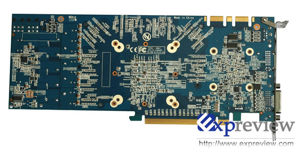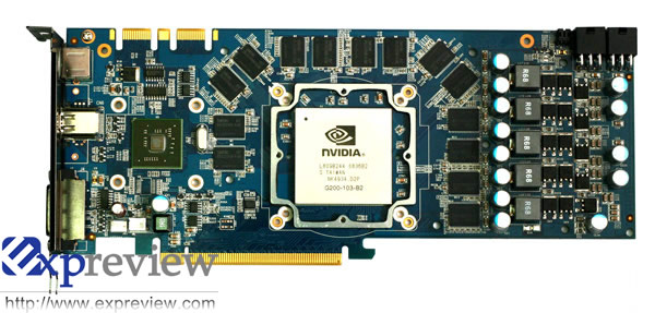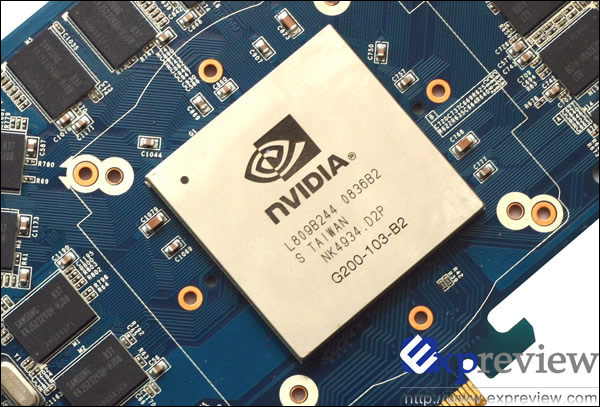 Как видно из приведённых изображений, дизайн печатной платы детища Galaxy Technology сильно отличается от референсного исполнения как новой, так и старой видеокарты GeForce GTX 260. Например, два 6-контактных разъёма питания сместились на самый край печатной платы, а подсистема питания, выполненная по схеме 4+1 фаза, имеет более упорядоченное и компактное размещение. Кроме того, по иному расположены и четырнадцать микросхем памяти GDDR3 от Samsung суммарным объёмом 896 Мб с 448-битным интерфейсом и временем выборки 1,0 нс. Они полукругом огибают графический процессор, у которого, кстати, рамка имеет весьма необычную форму. А вот чип NVIO2 остался на своём месте в левой части печатной платы, зато набор коммуникационных возможностей расширился за счёт порта HDMI, добавленного к разъёму DVI и выходу HDTV.