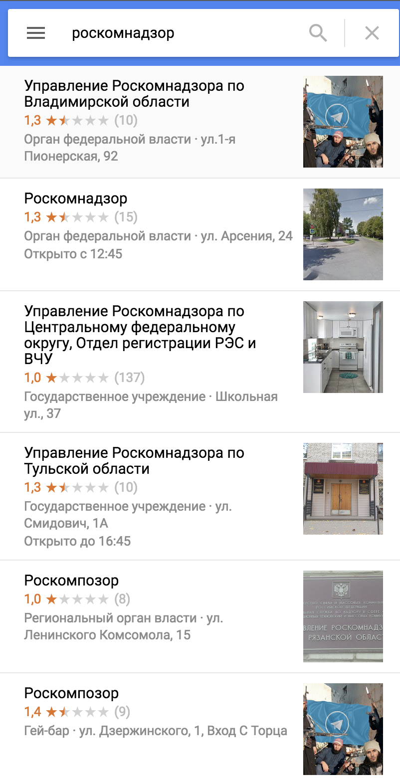 Российские пользователи устроили атаку на сервис Google Maps с целью изменить название о Роскомнадзоре. Главное здание ведомства в Китайгородском проезде в Москве оказалось переименовано в «Роскомпозор», а в графе «время работы» указали, что оно «Закрыто навсегда». На это обратило внимание издание «Медуза».