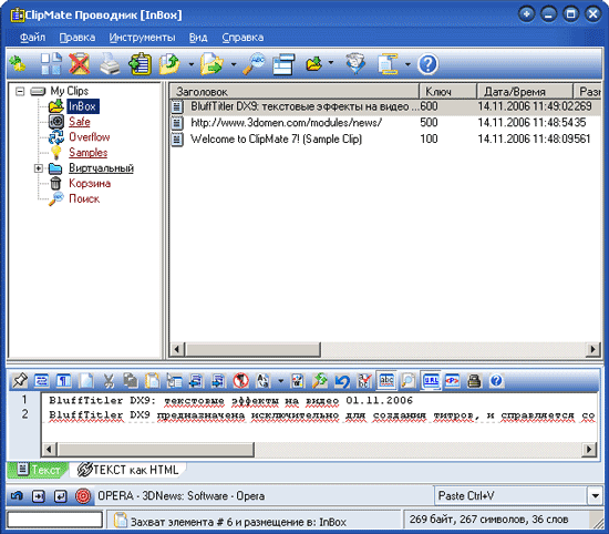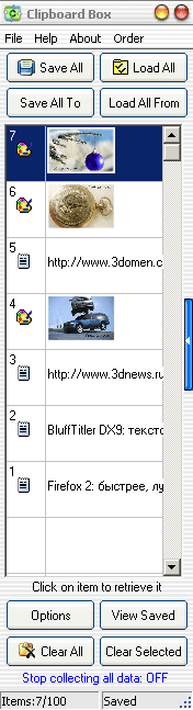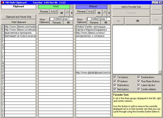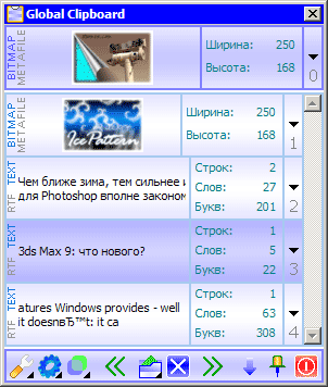 Программы для работы с буфером обмена http://www.3dnews.ru/_imgdata/ico/2006/11/14/187742.jpg Буфер обмена относится к инструментам, с которыми работают все: скопировать текст с веб-странички в окно ICQ-клиента, вставить ссылку на интересную утилиту в менеджер загрузки, сделать копию экрана и открыть ее в Photoshop для редактирования – во всех этих и многих других случаях без буфера обмена не обойтись. Но это удобное средство обмена данными не лишено недостатков. Самый досадный – сохранение только последнего скопированного в него фрагмента текста или графики. Конечно же, если вы работаете с MS Office 2003, то в буфере обмена может храниться до 24 фрагментов, но, во-первых, для работы с расширенным буфером обмена нужно, чтобы была запущена одна из программ офисного пакета, а во-вторых, при ее закрытии все данные исчезают бесследно. В этом обзоре мы рассмотрим несколько интересных утилит, расширяющих возможности буфера обмена и предлагающих более удобный способ хранения занесенных в него данных. Clipboard Box 3.3 Clipboard Box не может похвастаться наличием большого числа функций, но все равно превосходит стандартный буфер обмена. Программа может сохранять до ста графических и текстовых фрагментов. Помещение нового элемента сопровождается негромким звуком, но не более того – в целом, утилита очень ненавязчива и без лишней надобности никакими всплывающими окнами не беспокоит. http://www.3dnews.ru/_imgdata/img/2006/11/14/32841.gif Окно программы похоже на расширенный буфер обмена MS Office – изображения показываются в виде эскизов, а для текста отображаются первые символы. Стоит навести курсор на сохраненный элемент, и во всплывающем окошке отобразится текстовый фрагмент полностью или картинка в увеличенном варианте. Один щелчок по сохраненному элементу, и он будет вставлен. Чтобы не перегружать базу данных одинаковыми фрагментами, в программе предусмотрена возможность распознавания дубликатов. Если вы копируете в буфер текст или изображение, которое уже занесено в базу, Clipboard Box повторно его не сохраняет. Не очень удобно то, что при закрытии программы данные автоматически не сохраняются – для этого нужно нажать кнопку Save All. При этом все текстовые фрагменты сохраняются в файлы TXT, а изображения – в файлы BMP. Сохранять при помощи Clipboard Box несколько наборов данных проблематично – по умолчанию они перезаписывают те, которые были сохранены раньше. Именно поэтому программу стоит использовать не как временное пристанище ссылок, картинок и прочих данных, а как базу данных текстовых фрагментов, которыми вы постоянно пользуетесь, например, для отправки писем или написания сообщений на форумах. Создав базу данных часто используемых слов и словосочетаний, можно отключить сбор данных в настройках программы, после чего назначить для вставки каждого фрагмента свое сочетание клавиш. Clipboard Box распространяется как shareware. Триал-версию, рассчитанную на 40 запусков, можно скачать отсюда Global Clipboard 2.1 В отличие от предыдущей утилиты, Global Clipboard бережно сохраняет все данные при закрытии, не спрашивая об этом пользователя, поэтому с успехом может использоваться как дневник ежедневных операций. Поэтому если потеряли ссылку, которую вам прислали утром, загляните в программу, и вы ее там, скорее всего, найдете. Global Clipboard может хранить до 1000 картинок и фрагментов текста в одном наборе, а таких наборов может быть неограниченное к