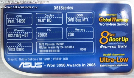Традиционная наклейка с техническими характеристиками ноутбука, немного поменявшая свою форму, обращает внимание на объем локальной видеопамяти, который равен 1 Гб. Разумеется, не сообщается о типе памяти.