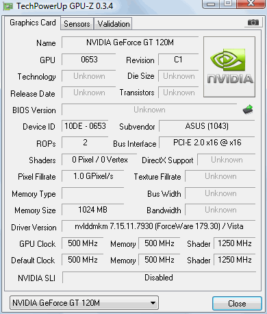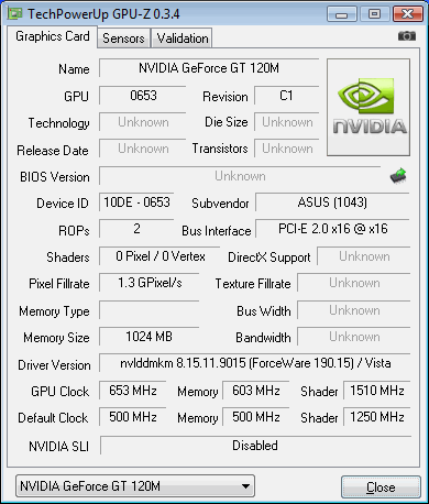 Утилита GPU-Z пока не определяет число функциональных блоков, однако предоставляет верную информацию о частотной формуле GeForce GT 120M.