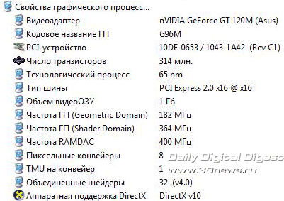 Попытка узнать на официальном сайте компании NVIDIA характеристики видеокарты закончилась неудачей. После адаптера GeForce G110M сразу следует GeForce G130M. На помощь нам пришел пакет Lavalays EVEREST, который верно отобразил число функциональных блоков.