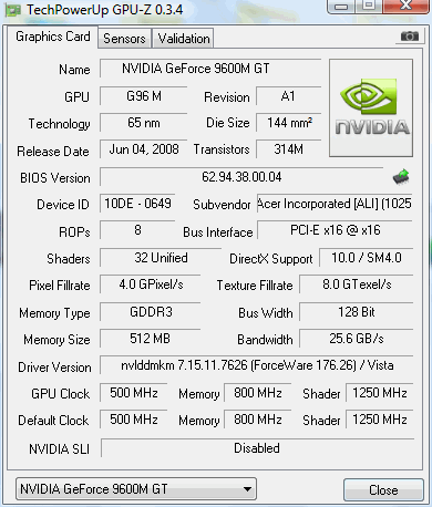Итак, видеокарта GeForce GT 120M построена на базе чипа G96M производимого с соблюдением норм 65-нм техпроцесса. Другими словами перед нами не что иное, как GeForce 9600M GT, правда, с другой частотной формулой.