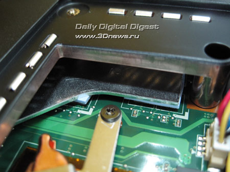 Под крышкой ноутбука ASUS X61S скрывается система охлаждения и рассматриваемый графический адаптер GeForce GT 120M, который распаян на материнской плате. Рядом с чипом находятся модули памяти.