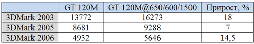 Тестирование проводилось при помощи тестовых пакетов 3DMark 2003/2005/2006. В таблице отображены результаты с разгоном и без такового.