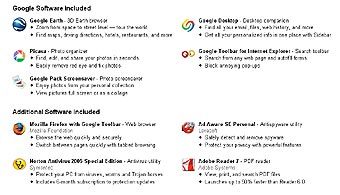 В стандартной ситуации пользователю необходимо устанавливать каждый инструмент в отдельности, конфигурируя и настраивая его. Google предложила свести эти процедуры к единой процедуре установки, для чего были достигнуты договоренности с несколькими сторонними производителями. В результате, отмечают в компании, для установки Google Pack необходимо согласиться всего с одним общим лицензионным соглашением, также отмечается отсутствие "мастеров" (wizards). В качестве браузера пакет предлагает Mozilla Firefox, присутствует блокировщик рекламы Ad-Aware, антивирусный модуль Norton AntiVirus 2005 SE, медиаплейер RealPlayer, программа для интернет-пейджинга Trillian. Они сопровождаются набором программ от самой Google, в который входит еще один интернет-пейджер Google Talk, локальный поисковик Google Desktop, "модель Земли" Google Earth и другие инструменты. Все программы начинают работать после единой установки Google Pack и могут комплексно обновляться через Интернет с помощью специального средства Google Updater.